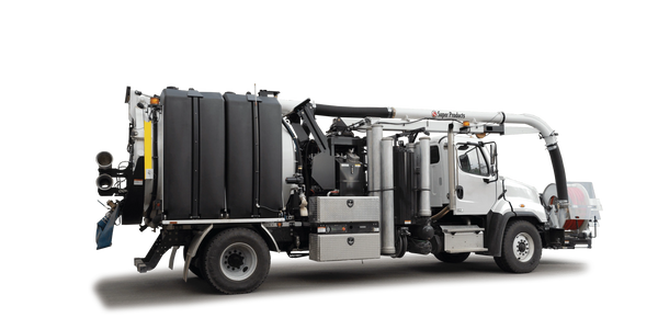 All 1200 models come standard with a high dump subframe eliminating the need of body-lift mechanisms or back up ramps during debris removal. The 1200 Dump model utilizes a dump unloading system. This allows operators to have the capability to dump into a 42-inch container, while still maintaining a low overhead height during normal operation and a low center of gravity for increased stability. Optional features offer increased performance capabilities. A hydro excavation package allows operators to jet, vacuum and excavate continuously all day long, while an optional pusher axle allows for increased legal payload.